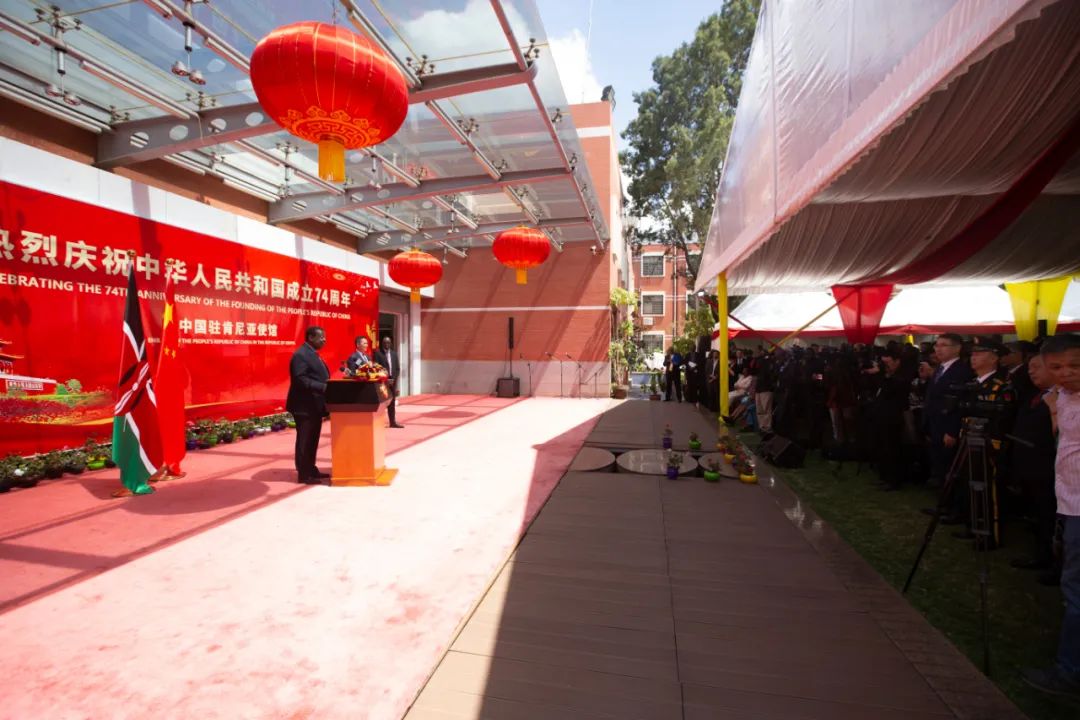 當(dāng)?shù)貢r(shí)間9月27日,中甘國際肯尼亞公司受邀參加中國駐肯尼亞使館舉行的招待會(huì),熱烈慶祝中華人民共和國成立74周年。駐肯大使周平劍,肯內(nèi)閣首席部長穆達(dá)瓦迪、國民議會(huì)副議長舍萊伊等各界人士,外國駐肯使節(jié),中資機(jī)構(gòu)和華僑華人等600余人出席。