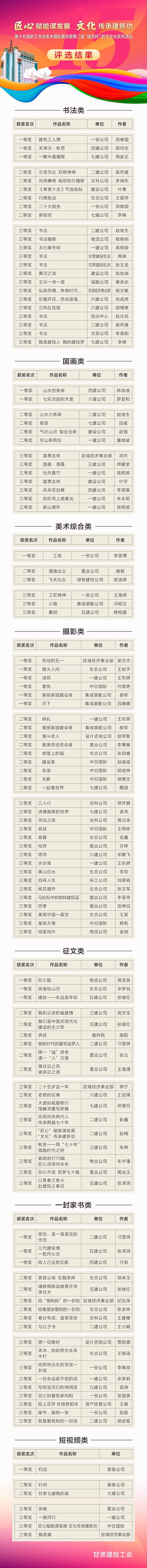 近日,甘肅建投工會“匠心”賦能謀發(fā)展 “文化”傳承建新功——第十五屆職工書法美術(shù)攝影展覽暨第二屆“隴藝杯”職工文化系列活動評選結(jié)果揭曉,獻禮甘肅建投建司70周年。
