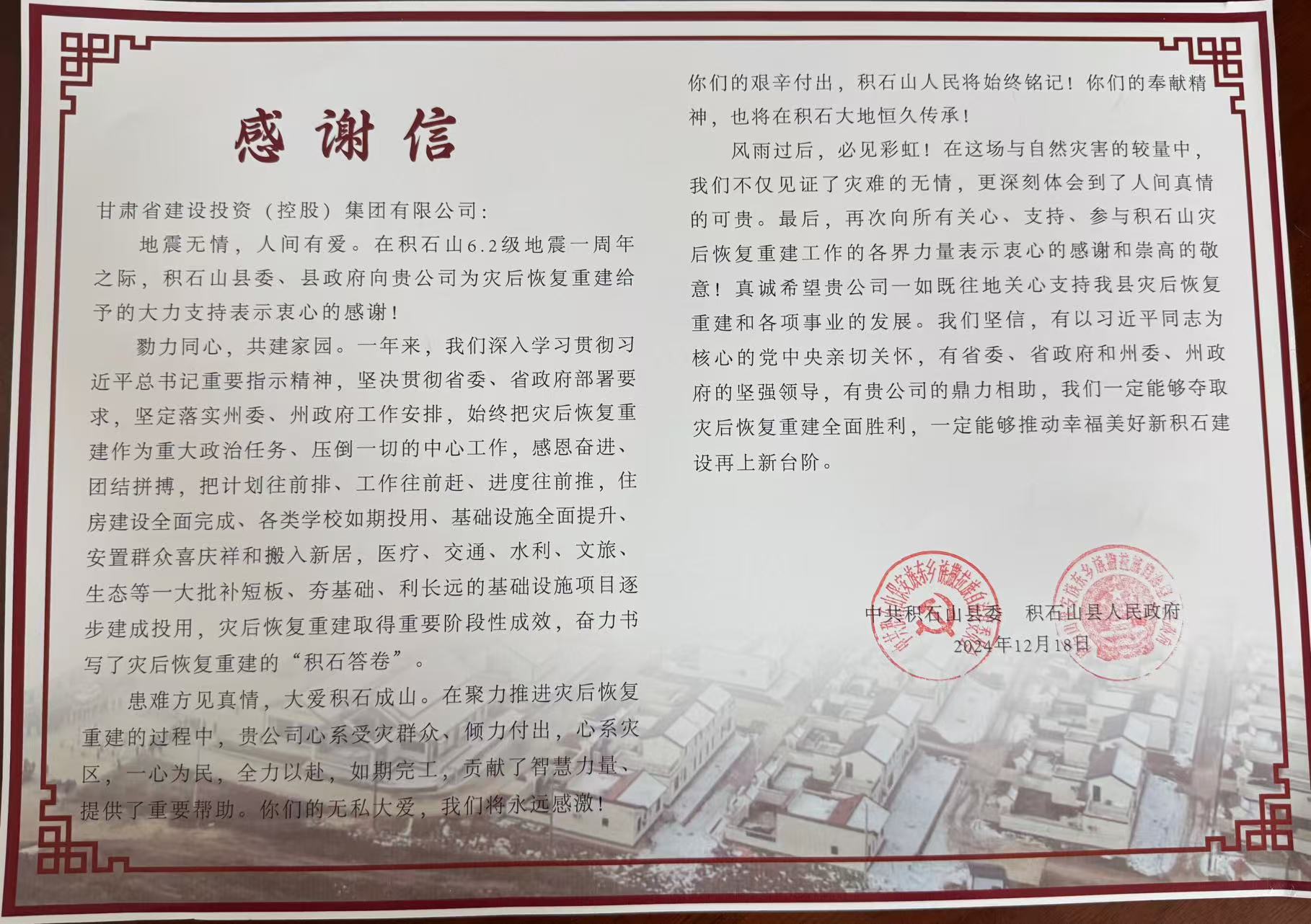 臘月二十三,北方小年。中共積石山縣委、積石山縣人民政府為甘肅建投送來感謝信,對(duì)甘肅建投在災(zāi)后恢復(fù)重建給予的大力支持表示感謝,并致以節(jié)日問候。