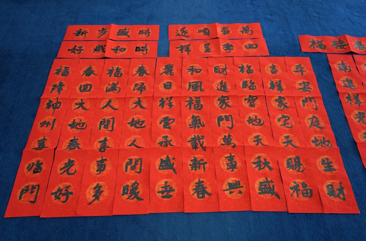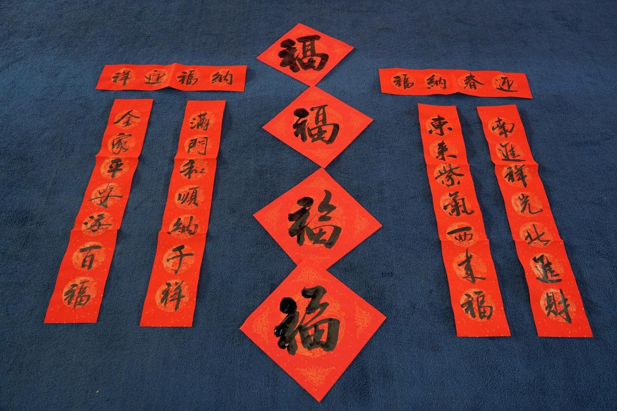 “南進祥光北進財 東來紫氣喜來?!保按猴L得意納千祥 旭日臨門添百?!保案U占议T萬事興 喜居寶地千年旺”……一副副春聯(lián)用黑色大字寫在灑金紅紙上,洋溢著喜慶氣息和年味。