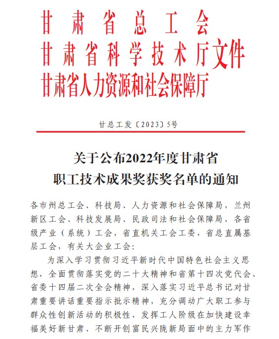近日,從甘肅省總工會、甘肅省科技廳、甘肅省人力資源和社會保障廳聯(lián)合發(fā)布的《關(guān)于公布2022年度甘肅省職工技術(shù)成果獎獲獎名單的通知》獲悉,甘肅建投獲第十五屆全省職工優(yōu)秀技術(shù)創(chuàng)新成果獎二等獎1項、三等獎1項,第七屆全省職工先進技術(shù)操作法提名獎1項。這是繼2021年甘肅建投獲得第十四屆全省職工優(yōu)秀技術(shù)創(chuàng)新成果獎一等獎以來的又一佳績。