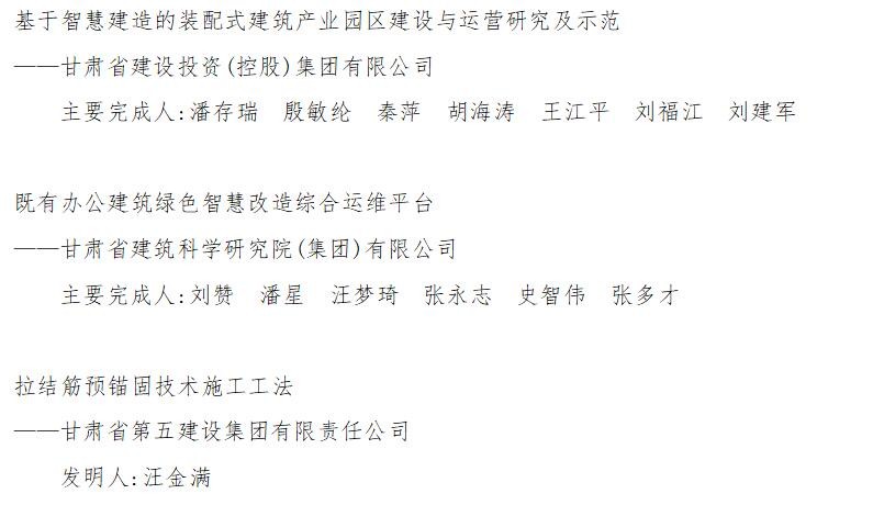 由集團公司申報的《基于智慧建造的裝配式建筑產(chǎn)業(yè)園區(qū)建設(shè)與運營研究及示范》項目獲得第十五屆全省職工優(yōu)秀技術(shù)創(chuàng)新成果獎二等獎。該項目立足甘肅省裝配式建筑產(chǎn)業(yè)發(fā)展實際,積極響應(yīng)國家、甘肅省推進裝配式建筑產(chǎn)業(yè)發(fā)展的若干政策及意見,依托甘肅建“榆中創(chuàng)新科技產(chǎn)業(yè)園”、“天水裝配式建筑產(chǎn)業(yè)園”,基于智慧工廠理念,將互聯(lián)網(wǎng)、5G、物聯(lián)網(wǎng)、人工智能、設(shè)備監(jiān)控、智能機器人、云計算和BIM技術(shù)及園區(qū)的建設(shè)與運營深度融合應(yīng)用,打造基于智慧建造的裝配式建筑產(chǎn)業(yè)園區(qū)。通過項目研究與工程應(yīng)用,建立了智慧園區(qū)技術(shù)標(biāo)準(zhǔn)體系,完善了現(xiàn)代企業(yè)管理、技術(shù)和產(chǎn)業(yè)人才隊伍培養(yǎng)機制,促進了新型建筑工業(yè)化背景下我省裝配式建筑的標(biāo)準(zhǔn)化設(shè)計,實現(xiàn)了我省裝配式建筑產(chǎn)業(yè)的工廠化生產(chǎn)、裝配化施工和信息化管理,有力推動了我省裝配式建筑產(chǎn)業(yè)及產(chǎn)業(yè)鏈相關(guān)工業(yè)產(chǎn)業(yè)的高質(zhì)量發(fā)展。 由建科院公司申報的《既有辦公建筑綠色智慧改造綜合運維平臺》項目獲得第十五屆全省職工優(yōu)秀技術(shù)創(chuàng)新成果獎三等獎。由五建公司申報的《拉結(jié)筋預(yù)錨固技術(shù)施工工法》獲得第七屆全省職工先進技術(shù)操作法提名獎。 “十四五”以來,甘肅建投緊緊圍繞國家科技強國戰(zhàn)略和甘肅省“四強行動”戰(zhàn)略,緊抓政策機遇,將科技創(chuàng)新作為企業(yè)發(fā)展的動力、人才培養(yǎng)作為企業(yè)發(fā)展的重要資源,持續(xù)增大研發(fā)投入,加強企業(yè)與高??蒲性核漠a(chǎn)學(xué)研合作,推動科技成果轉(zhuǎn)化落地。甘肅建投在技術(shù)標(biāo)準(zhǔn)、知識產(chǎn)權(quán)、科技獎項、科技創(chuàng)新平臺等方面取得了多項科技成果,助力企業(yè)高質(zhì)量完成甘肅建投“十四五”發(fā)展規(guī)劃科技創(chuàng)新相關(guān)工作。
