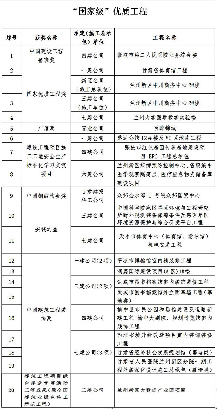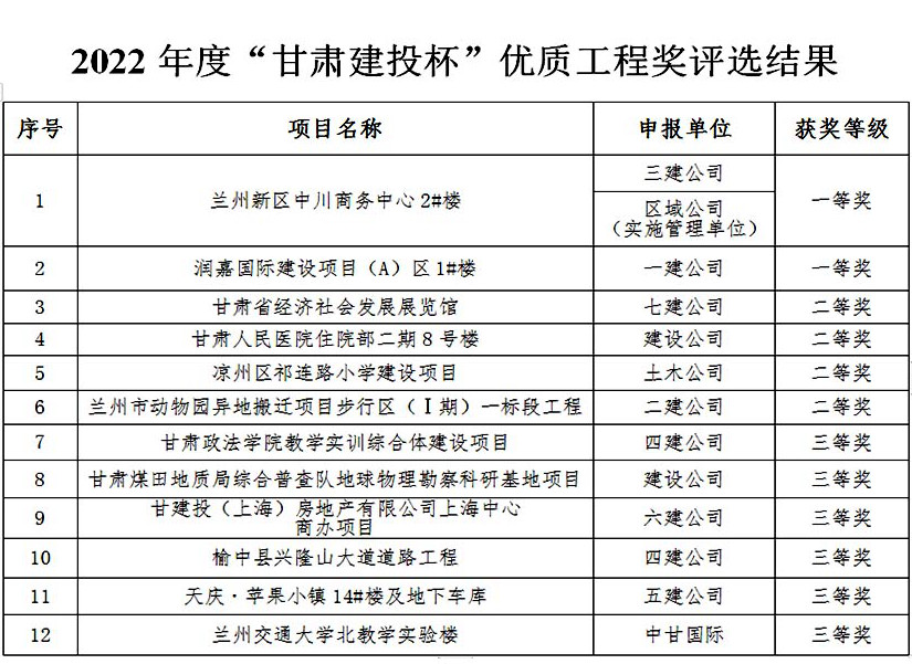 2022年集團(tuán)公司對標(biāo)高質(zhì)量發(fā)展要求,著力提升企業(yè)運(yùn)營管理能力,創(chuàng)造了“量質(zhì)同升”的新局面。一年來,共獲得國家級質(zhì)量獎共計19項,省部級、地市級榮譽(yù)獎項近百項,質(zhì)量管理工作取得了較好成績。特別是在全省每年僅有1個“魯班獎”名額的情況下,集團(tuán)公司連續(xù)四年獲此殊榮;2022年,全省“國家優(yōu)質(zhì)工程獎”4個名額,甘肅建投獨(dú)獲其中3項;“中國鋼結(jié)構(gòu)金獎”“廣廈獎”全省各1項均由甘肅建投獲得;全省獲得“中國建筑工程裝飾獎”16項,甘肅建投占其中8項;全省獲得“建設(shè)工程項目施工工地安全生產(chǎn)標(biāo)準(zhǔn)化學(xué)習(xí)交流項目”3項也均由甘肅建投獲得。這些獎項的獲得極大地提升了集團(tuán)公司品牌影響力和社會形象。
