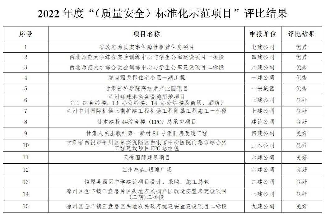 此外,2022年“(質(zhì)量安全)標(biāo)準(zhǔn)化示范項目”共評選出15個示范項目,其中“優(yōu)秀”項目5項,給予項目部5萬元的獎勵,獎勵共計25萬元;2022年“甘肅建投杯”一等獎2項、二等獎4項、三等獎6項,一等獎、二等獎、三等獎項目分別給予其項目部10萬元、6萬元、3萬元的獎勵,并對獲獎單位主管部門一次性獎勵5000元,獎勵共計77.5萬元。