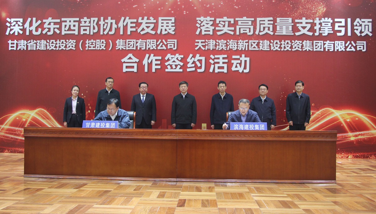 甘肅建投副總經(jīng)理胡巖與天津?yàn)I海建投黨委委員、副總經(jīng)理殷強(qiáng)代表雙方在合作協(xié)議上簽字。